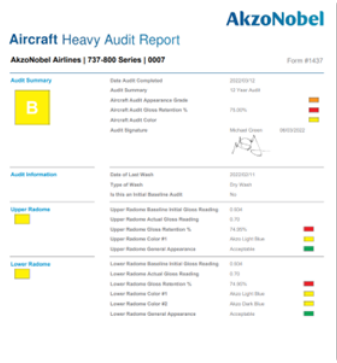 A detailed audit report provides the baseline against which a future paint schedule can be defined. It includes dry film thickness measurements, gloss readings, color and a general appearance rating on all parts of the airplane, from the radome, captain and forward entry through to the fuselage, wings and engines.